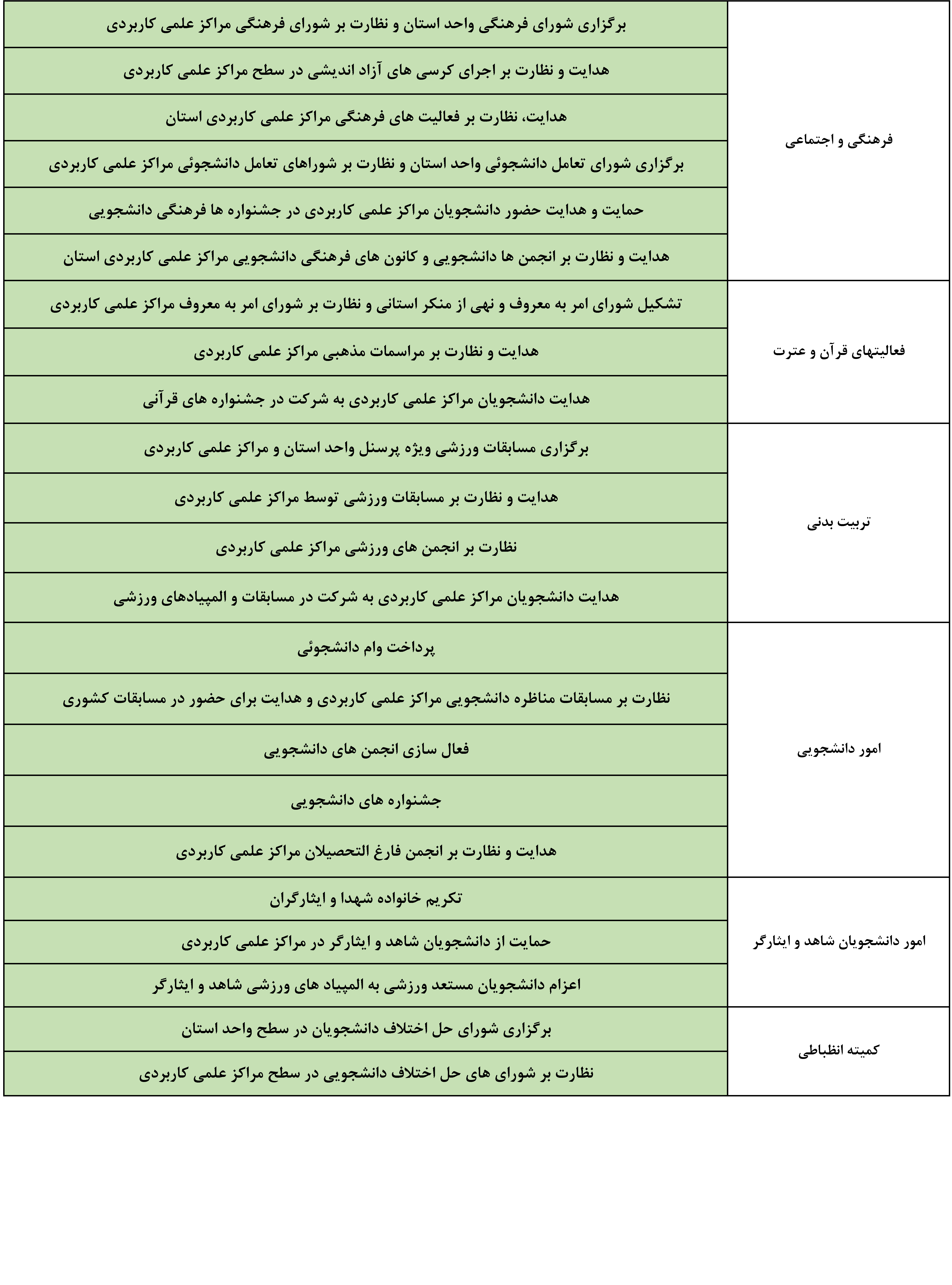 دانشگاه جامع علمی- کاربردی در کنار آموزش مناسب دانشجویان زمینه رشد جسمانی، عاطفی و روانی آنان را فراهم میسازد و این امکان را فراهم میکند که ارزشهای اخلاقی و اجتماعی در دانشجویان نهادینه شود. همچنین سازمان دادن کانون های فرهنگی و اجتماعی با هماهنگی سایر بخش ها ، بسط فعالیت های اجتماعی ، تلاش برای توسعه مشارکت اجتماعی دانشجویان مدرسین و کارکنان ، بهره گیری از ظرفیت علمی دانشگاه برای ارتقاء سطح فرهنگی ، حفظ ارزش های اسلامی در کلیه مراکز آموزشی ، برنامه ریزی برای ورود مدرسین و کارکنان در فعالیت های فرهنگی دانشگاه ، تقویت و توسعه فرهنگ مهارت محوری در بین دانشجویان اعتلای فرهنگ اسلامی و ایرانی در بین دانشجویان ، توسعه و تعمیق مبانی عقیدتی ، معرفتی ، سیاسی و فردی در محیط دانشگاه ، ارتقاء کیفیت در فعالیت ها و خدمات فرهنگی در حد استاندارد دانشگاه ،گسترش فرهنگ مهارت افزایی ،خودباوری ، خود اتکایی ، خلاقیت و نوآوری و اعتقاد به نفس در کلیه ارکان دانشگاه از وظایف این بخش از دانشگاه است.